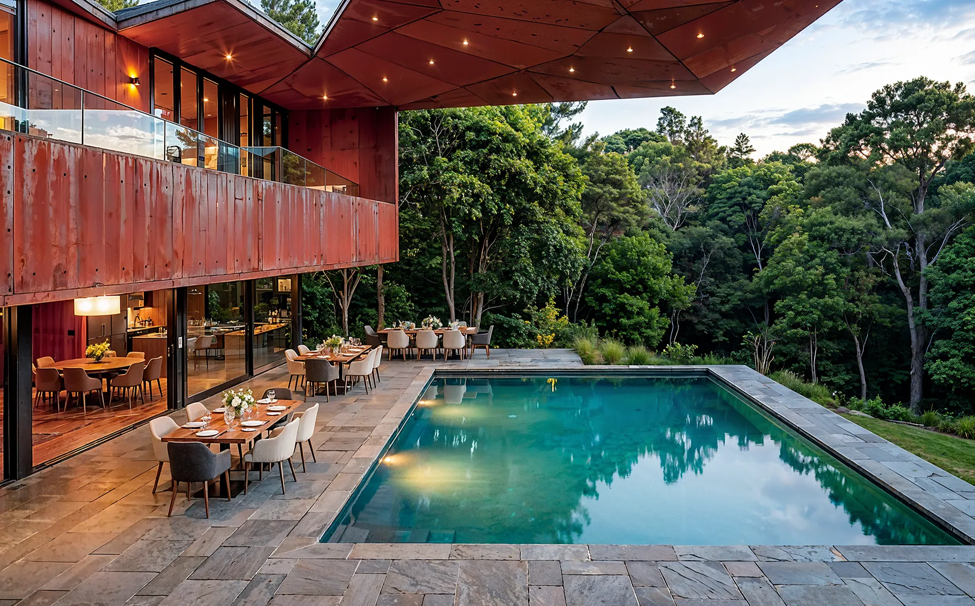 La planta baja se libera y se expande hacia la piscina, generando una relación directa con el paisaje.